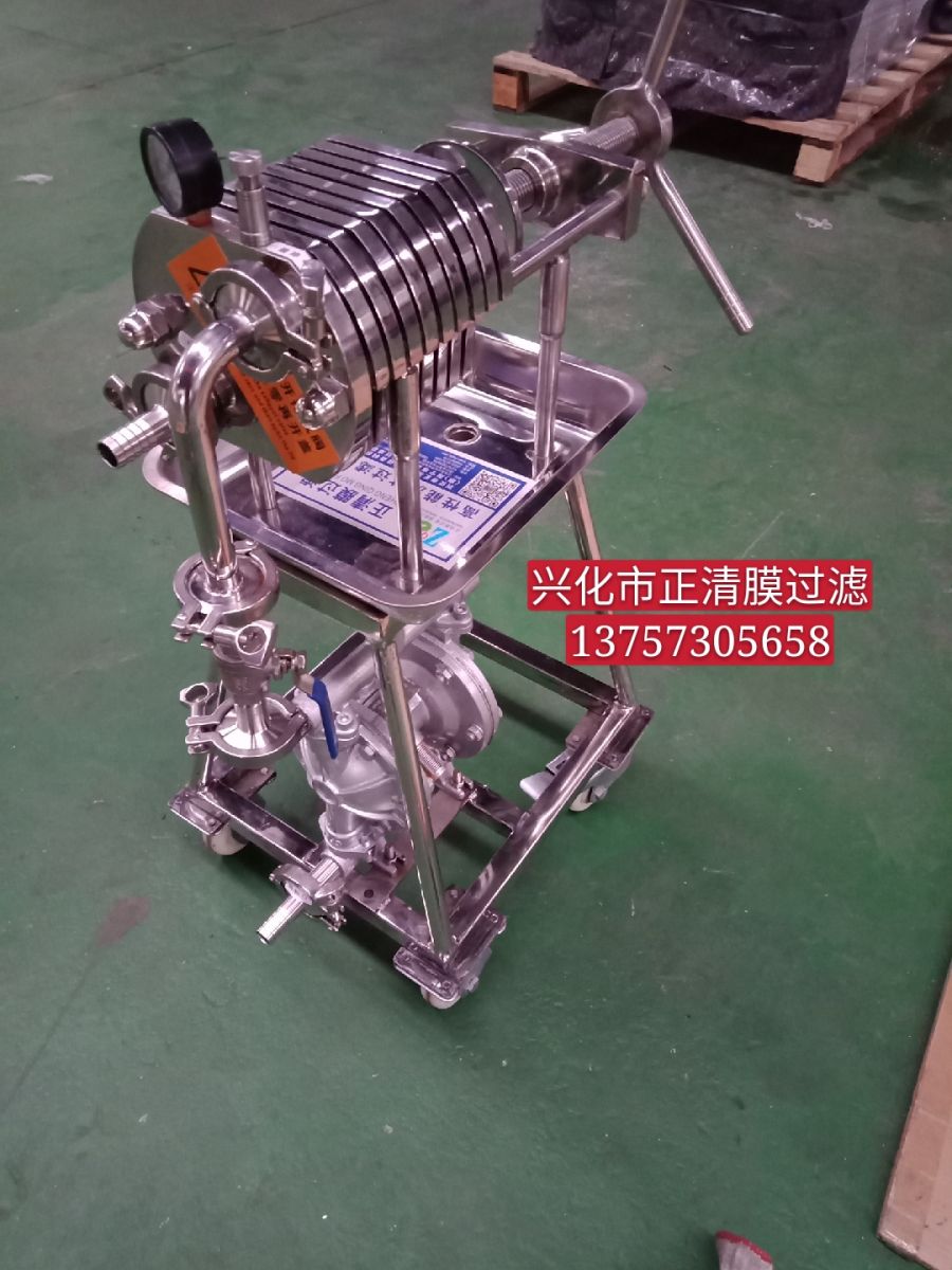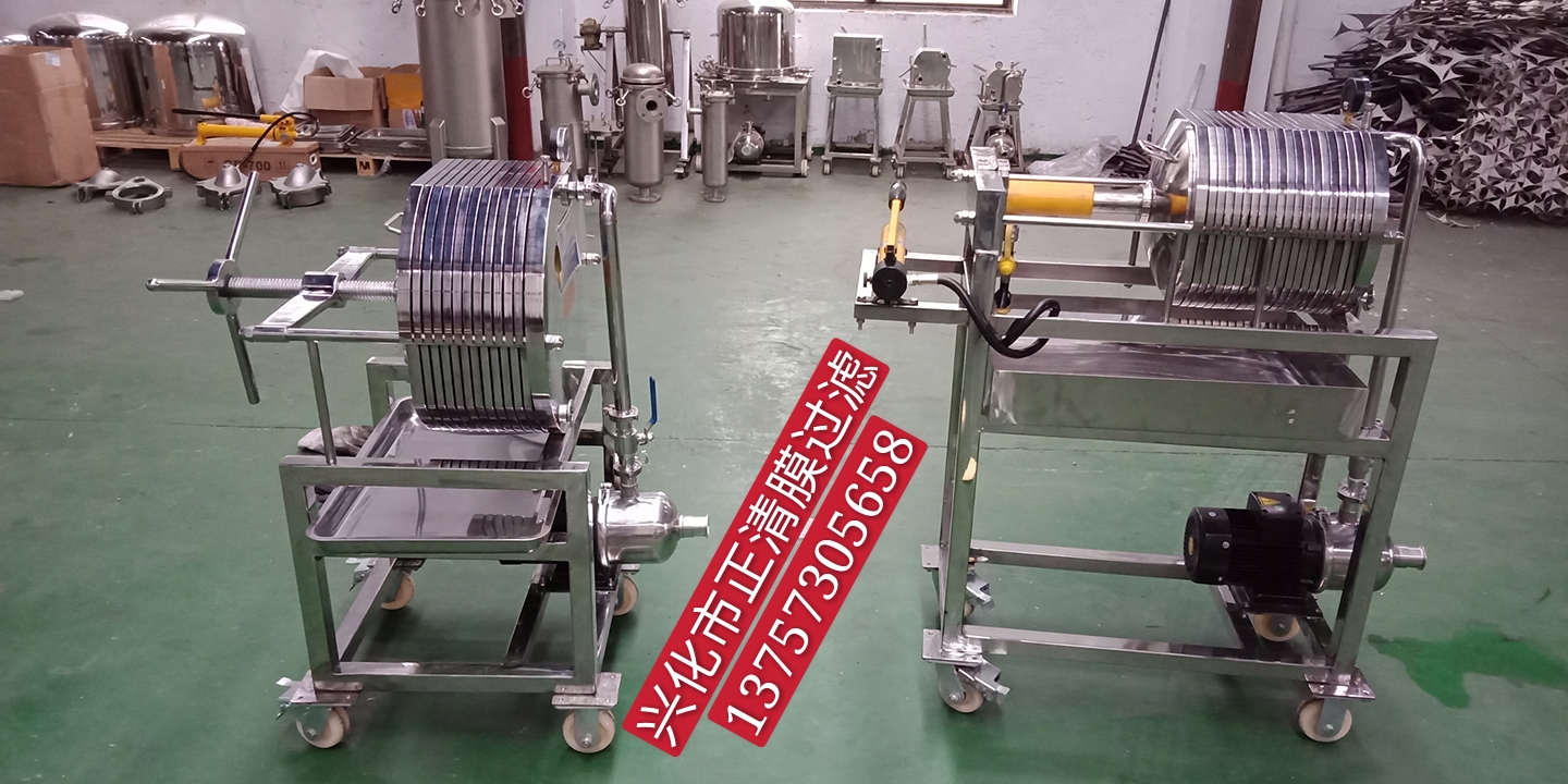 | 注:需要面積加大可定做, 20層以上為雙進(jìn)雙出加大流量。本臥式板框過濾器最大可加工100層,采用液壓壓緊。 |  不銹鋼臥式板框過濾器,根據(jù)不同過濾介質(zhì)和生產(chǎn)工藝(初濾、脫活性碳、除微粒、半精濾、精濾)配微孔濾膜能達(dá)到除菌處理的目的,還可根據(jù)過濾量的大小,減少或增加過濾層數(shù),使之適合生產(chǎn)需要。本機(jī)密封部件采用醫(yī)用硅橡膠或氟橡膠,無滲漏,密封性能好。本機(jī)還可根據(jù)用戶需要,特制多級(jí)過濾裝置,一級(jí)放較粗的濾材,二級(jí)放較細(xì)的濾材,既節(jié)省了時(shí)間及設(shè)備又提高了過濾精度。板框過濾器配上微孔濾膜是目前解決過濾活性碳,微粒的理想設(shè)備。 板框過濾器使用須知:1、使用前注射水消毒。2、將濾材用蒸餾水浸濕后貼在網(wǎng)板上,再壓緊頂板。3、啟動(dòng)前先把泵內(nèi)加滿液體,再關(guān)閉進(jìn)液泵,然后啟動(dòng),逐漸打開液閥,并打開排氣閥排出機(jī)內(nèi)空氣。4、關(guān)閉時(shí)先關(guān)閉進(jìn)液閥,再關(guān)機(jī),防止突然停止液體回流擊環(huán)濾材。  本機(jī)濾材可選用(聚丙烯濾膜、增強(qiáng)型濾膜、濾紙、濾布,專用脫碳過濾膜)等,可根據(jù)用戶要求選用合適的濾材。