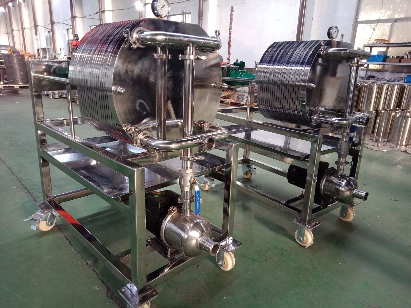 本機(jī)均采用SUS304或SUS316L優(yōu)質(zhì)不銹鋼材料制造,耐腐蝕,經(jīng)久耐用,本機(jī)濾板采用螺紋狀結(jié)構(gòu),可根據(jù)不同過(guò)濾介質(zhì)和生產(chǎn)工藝(初濾.半精濾.精濾)要求,更換不同濾材,直接用微孔濾膜能達(dá)到無(wú)菌的目的.用戶還可以根據(jù)過(guò)濾量的大小,相應(yīng)減少或增加層數(shù),使之流量適合過(guò)濾要求,400以上過(guò)濾器為增加流量、進(jìn)出液口設(shè)計(jì)成雙進(jìn)雙出,本機(jī)工作時(shí)加壓密封過(guò)濾,液料無(wú)損耗,液體澄清度好,又能滿足生產(chǎn)需要,本機(jī)所有密封部件采用硅橡膠密封圈,耐高溫.無(wú)毒.無(wú)滲漏,密封性能好又能提高過(guò)濾精度。
